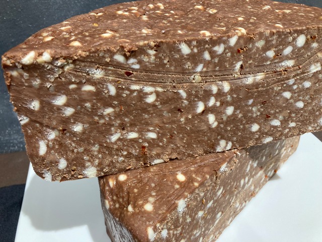 チョコロット イギリス・チェシャー州/牛乳製/セミハードタイプ チョコレートパウダーを練りこんだナチュラルチーズにミルクチョコとホワイトチョコのチップを加えて形成したデザートチーズ。 チーズというよりケーキのような見た目で、ほんのりとした酸味のあるチーズとチョコレートの甘さが絶妙な相性です。 カットしてそのままでティータイムや食後酒などと合わせるのがオススメです。 ※手作業でカットを行うため、重量が多少オーバーすることがございます。 ※100g単位での販売ですが、個数を増やしてご購入いただくと合計数量の塊でお届けいたします。100gのカットを複数購入したい場合はその旨を備考欄にご記入ください。 ※賞味期限は到着後14日程度です。